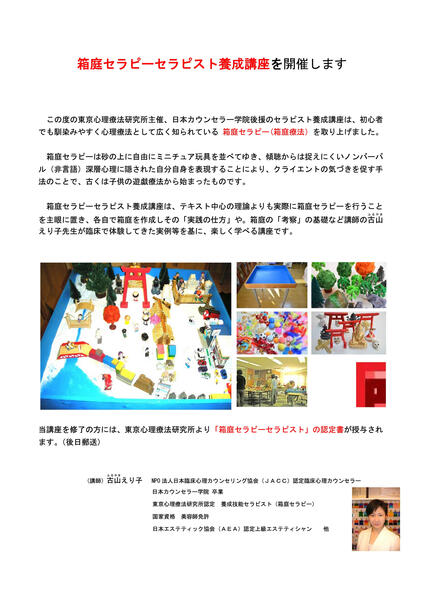 箱庭セラピーセラピスト養成講座は、テキスト中心の理論よりも実際に箱庭セラピーを行うことを主眼に置き、各自で箱庭を作成しその「実践の仕方」や。箱庭の「考察」の基礎など講師の古山(ふるやま)えり子先生が臨床で体験してきた実例等を基に、楽しく学べる講座です。